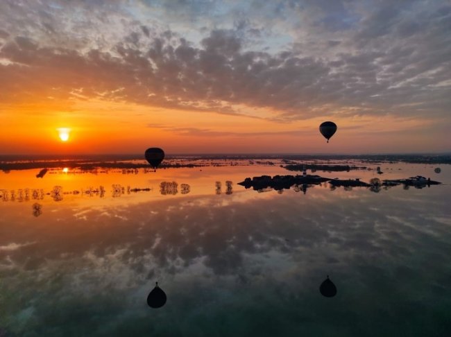 Рязанец Евгений Рыбаков опубликовал фотографии разлива Оки с воздушного шара на своей личной странице в социальной сети. Кадры сделаны возле села Шумашь на закате. Напомним, в Рязани из-за половодья река Ока соединилась с Ореховым озером.