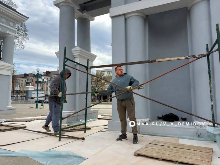 После наступления тепла реконструкция возобновилась. Строители огрунтуют арку и покрасят специальными стойкими составами.