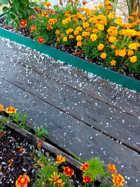 Автор публикации прикрепил фото, на котором видны крупные кусочки льда, которые усыпали цветочные клумбы.
