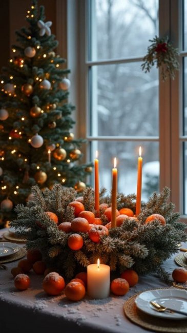 Не забудьте о других декоративных элементах. Подвесьте на окна снежинки или гирлянды, украсьте двери венками из еловых веток. Используйте свечи для создания уюта — они добавят тепла и света в зимние вечера.