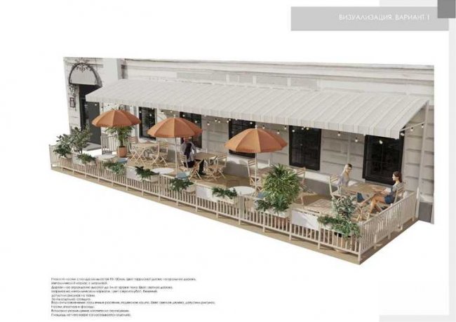 Конструкция сезонных кафе должна быть сборно-разборной и сохранять восприятие объекта культурного наследия. Допускается установка выносных столов, стульев и зонтов белого, бежевого или в цвет фасада. Запрещается применение ярких цветов.