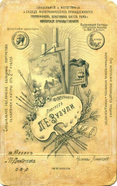Одним из самых популярных вещей в начале ХХ века стала фотография. Люди даже небольшого достатка могли запечатлеть себя для потомков. В Юзовке в разные годы насчитывалось одновременно до 8 фотографических заведений. Жесткая конкуренция заставляла фотографов рекламировать себя. Было несколько популярных размеров фотографий – альбомное (6х9 см) и кабинетное (10х15 см) фото. Фотография клеилась на картон. На лицевой стороне часто выдавливалось клише название фотоателье, а на оборотной стороне писались полное название, местонахождение и полученные фотографом за свое мастерство регалии.