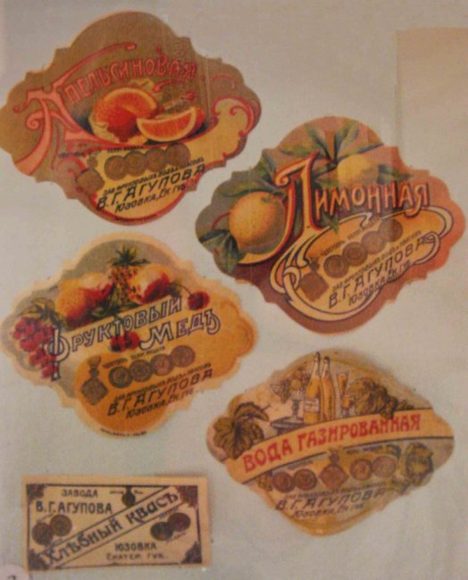Все изделия, предназначенные для среднестатистического обывателя, были ярко и оригинально оформлены. В фондах Донецкого краеведческого музея хранятся этикетки завода фруктовой воды и кваса В.Г. Агупова. У его продукции даже фаянсовые пробки имели логотип завода.