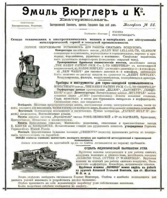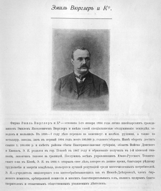Отдельной группой шли посреднические фирмы — технические конторы, поставлявшие заводам и шахтам машины и материалы, начиная от лопат и заканчивая насосами и электромоторами. Швейцарец Эмиль Яковлевич Вюрглер был одним из братьев Вюрглер – (Карла, Альберта и Эмиля), основавших кондитерскую промышленность Киева. Эмиль Яковлевич, кроме того, стал собственником ведущей в Екатеринославе фирмы по производству инженерно-коммуникационного оборудования, главой акционерной компании по поставке технического и электротехнического оборудования для горнозаводского промышленного юга России, директором-распорядителем Екатеринославского костеперерабатывающего завода, основанного в 1909 году, и представителем товарищества фабрики вентиляционных моторов в Екатеринославе.