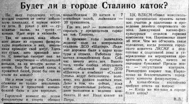 Нам не известно были ли приняты меры для устранения этого безобразия в 1951 году и получили ли этой зимой конькобежцы свой долгожданный каток. Вполне возможно, что статья возымела действие и ответственные (а точнее безответственные) товарищи выполнили то, что должны были, и жители Сталино смогли в 1951 заняться активными видами зимнего спорта.
