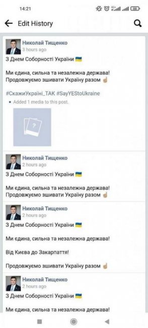 Однако после возмущения «патриотов» «уменьшением» страны Тищенко отредактировал текст. Фраза «от Киева до Закарпатья» исчезла из поздравительного поста «слуги народа», но осталась в правках.
