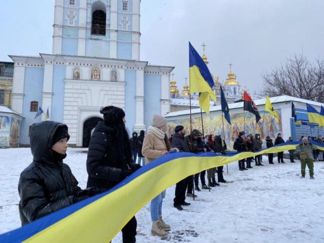 В столице Украины около 300 националистов собрались на Софийской площади и до Михайловского собора развернули 500-метровый флаг Украины.