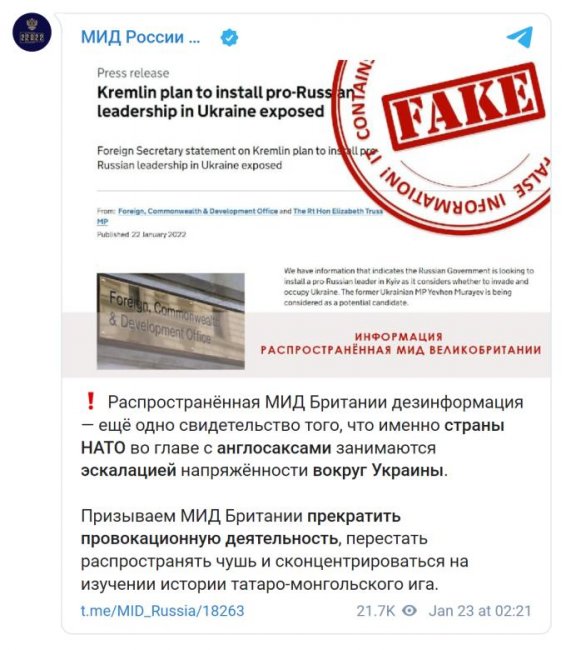 Российский МИД также назвал новость «дезинформацией и провокационной деятельностью». «Распространённая МИД Британии дезинформация — ещё одно свидетельство того, что именно страны НАТО во главе с англосаксами занимаются эскалацией напряжённости вокруг Украины», — говорится в сообщении, распространённом в Телеграме МИДа.