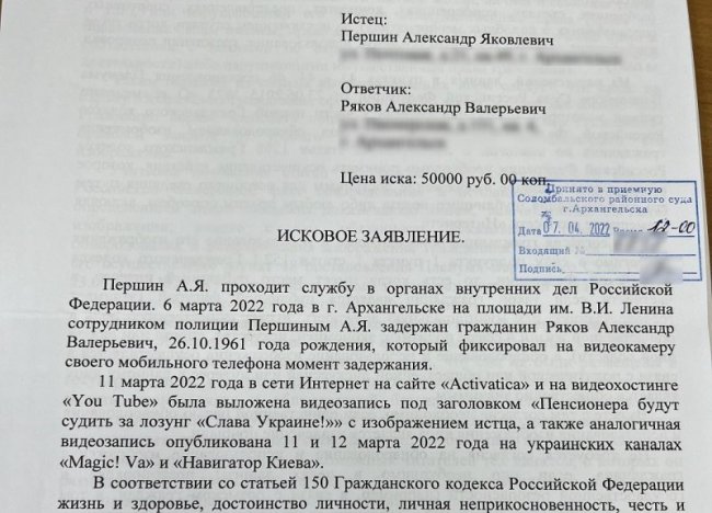 Поэтому полицейский Александр Першин обратился в суд с гражданским иском из-за опубликованного в интернете видео задержания. Кстати, сотрудник полиции выступает по иску как физическое лицо. Першин требовал удалить ролики и выплатить ему моральную компенсацию в 50 тысяч рублей. Но в октябре 2022 года Соломбальский районный суд Архангельска отказал Першину во взыскании с Рякова 50 тысяч рублей в качестве компенсации морального вреда. В мае этого года Архангельский областной суд оставил решение суда первой инстанции без изменений, а жалобу Першина без удовлетворения. Причём, в суде исследовали только тот факт, что гражданин Ряков осуществлял видеосъёмку, но это не свидетельствует о том, что он обнародовал видеозапись.