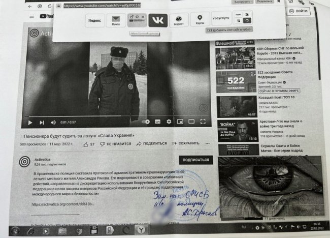 После выигранного суда над полицейским уже сам провокатор Ряков обратился в суд с требованием взыскать с полицейского деньги, за то что он потратился на адвоката. И надо же, какая неожиданность – здесь Архангельский суд внезапно сжалился над бедным пенсионером и… полицейского оштрафовали на 35 тысяч рублей! Причём, судья Чебыкина Наталья Александровна, которая вела процесс, решила, что лозунг «Слава Украине» во время СВО не является националистическим.