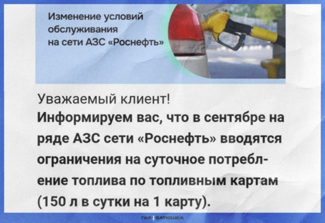 Тем временем крупнейший оператор топливных карт в России вводит ограничение на отпуск нефтепродуктов на сети «Роснефть» и «Газпром нефть», не более 150 литров в сутки.