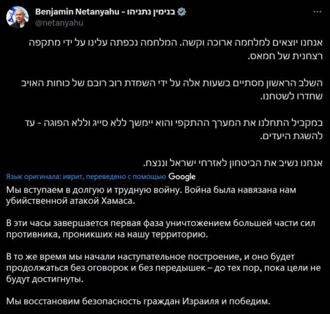 «Мы вступаем в долгую и трудную войну. Война была навязана нам убийственной атакой Хамаса. В эти часы завершается первая фаза уничтожением большей части сил противника, проникших на нашу территорию. В то же время мы начали наступательное построение, и оно будет продолжаться без оговорок и без передышек—до тех пор, пока цели не будут достигнуты. Мы восстановим безопасность граждан Израиля и победим»,—сказал Беньямин Нетаньяху.