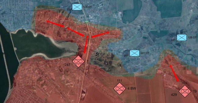 На Запорожском направлении ВС РФ прорвали оборону ВСУ в центре села Каменское. Теперь российские войска пытаются продвинуться в северную часть, а также проникать и накапливаться в юго-западной части села.