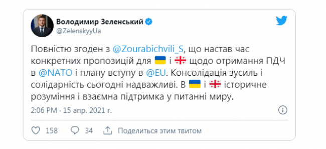 «Пора конкретных предложений для Украины и Грузии на получение ПДЧ в НАТО и плана вступления в ЕС. Консолидация усилий и солидарность сегодня сверхважные. В Украине и Грузии историческое понимание и взаимная поддержка в вопросе мира», — заявил он.